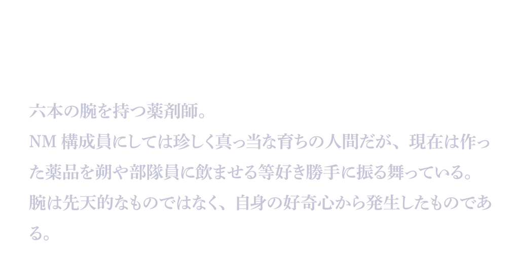 「堅実で普通そうな人物に見えますが、彼女も特務特化部の人間であることを忘れてはいけませんよ~?私たちと同じように、汚い事に手を染めることには大変慣れていらっしゃいますから。」