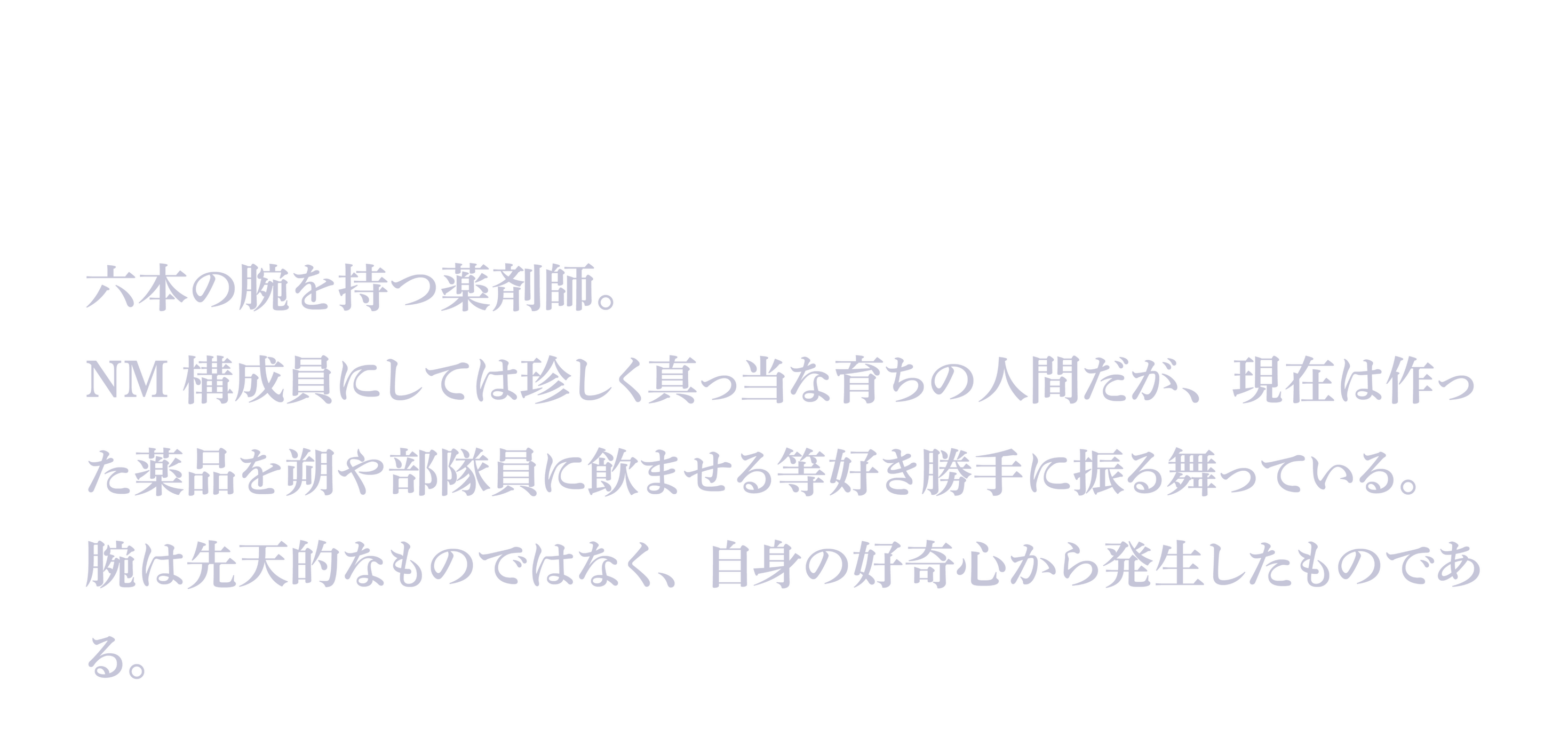 「堅実で普通そうな人物に見えますが、彼女も特務特化部の人間であることを忘れてはいけませんよ~?私たちと同じように、汚い事に手を染めることには大変慣れていらっしゃいますから。」